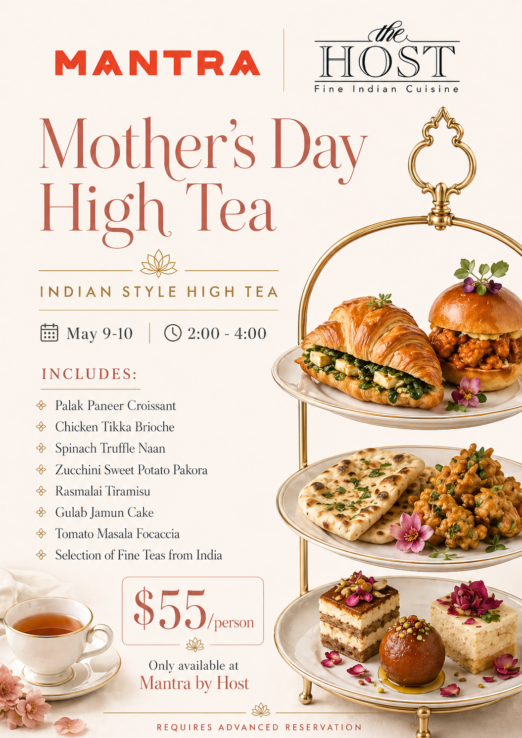 Our Indian Style High Tea special for Mother's Day. Indian style tea time snacks, fine teas from India all served on traditional high tea platters. tax and gratuity is extra.